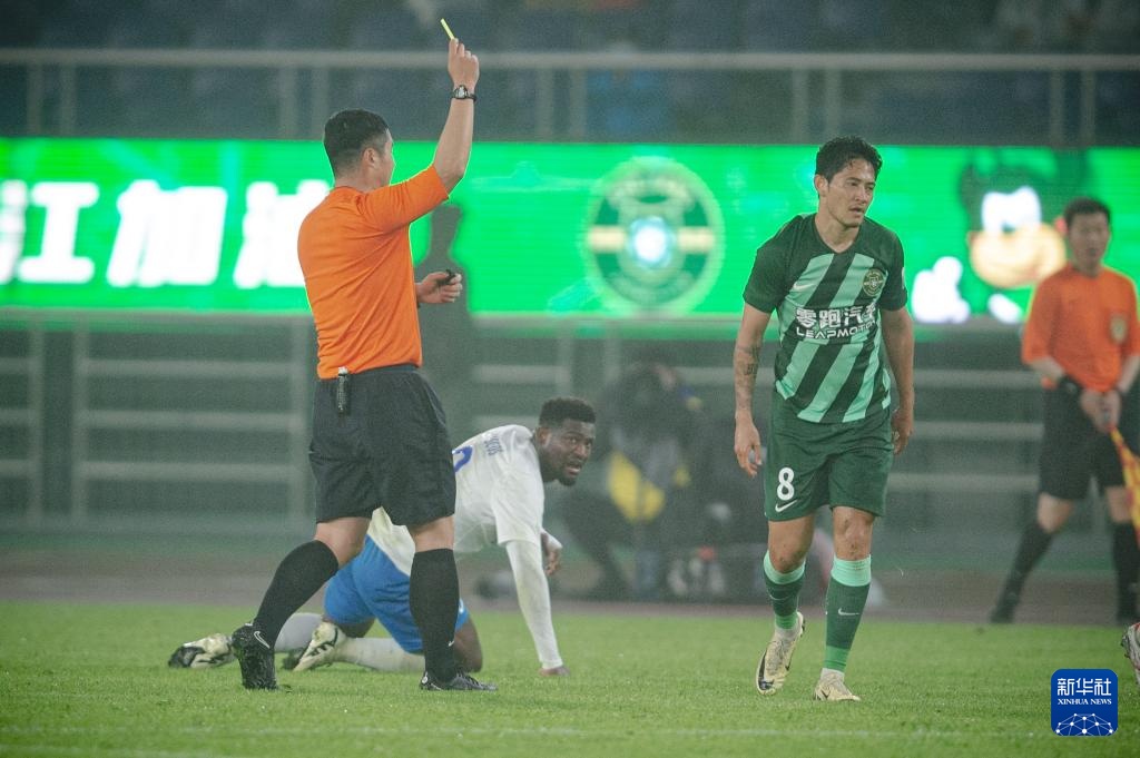 4月6日,主裁判徐强强(左)向浙江队球员钱杰给(右)出示黄牌。新华社记者 江汉 摄