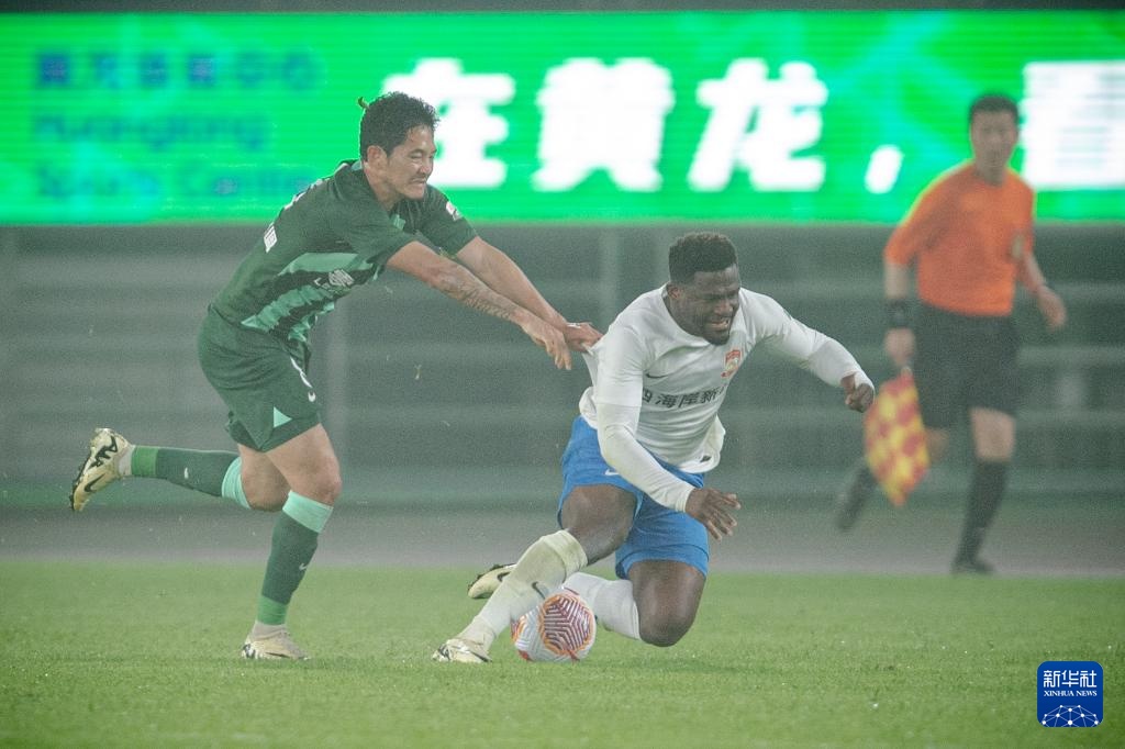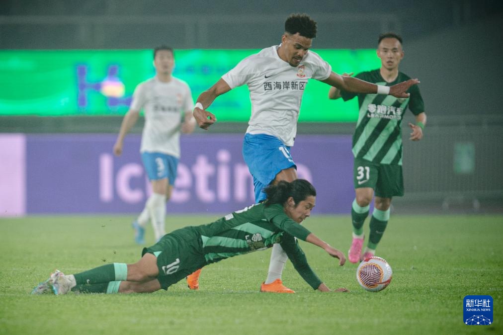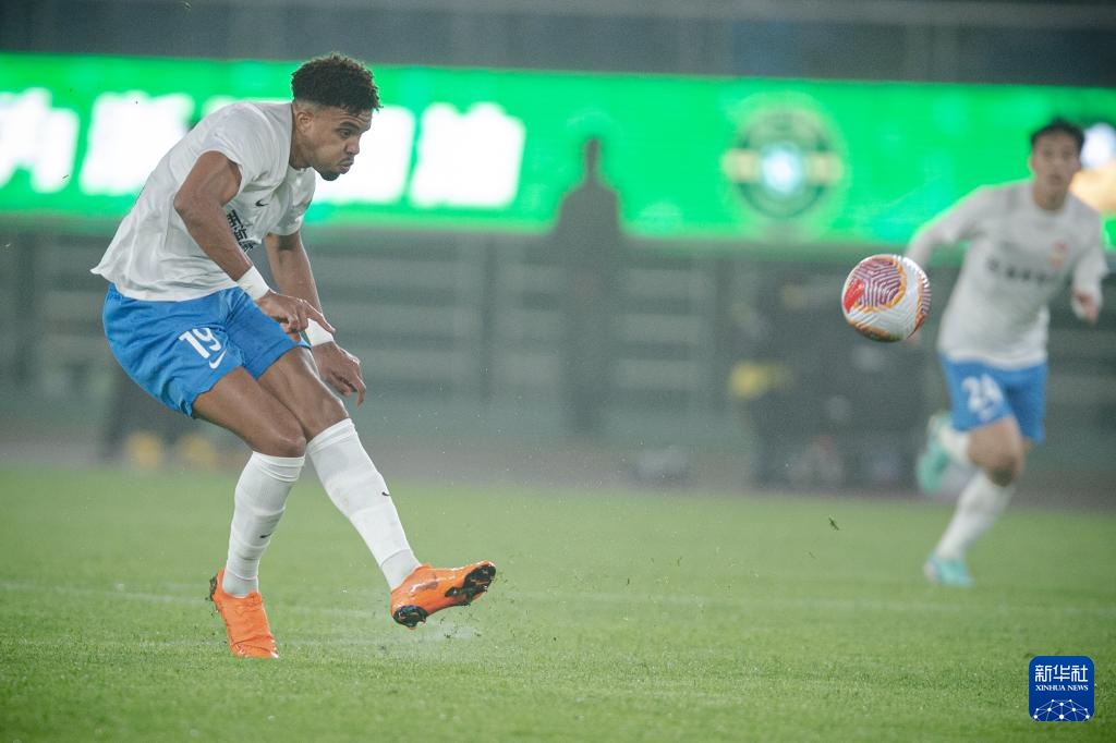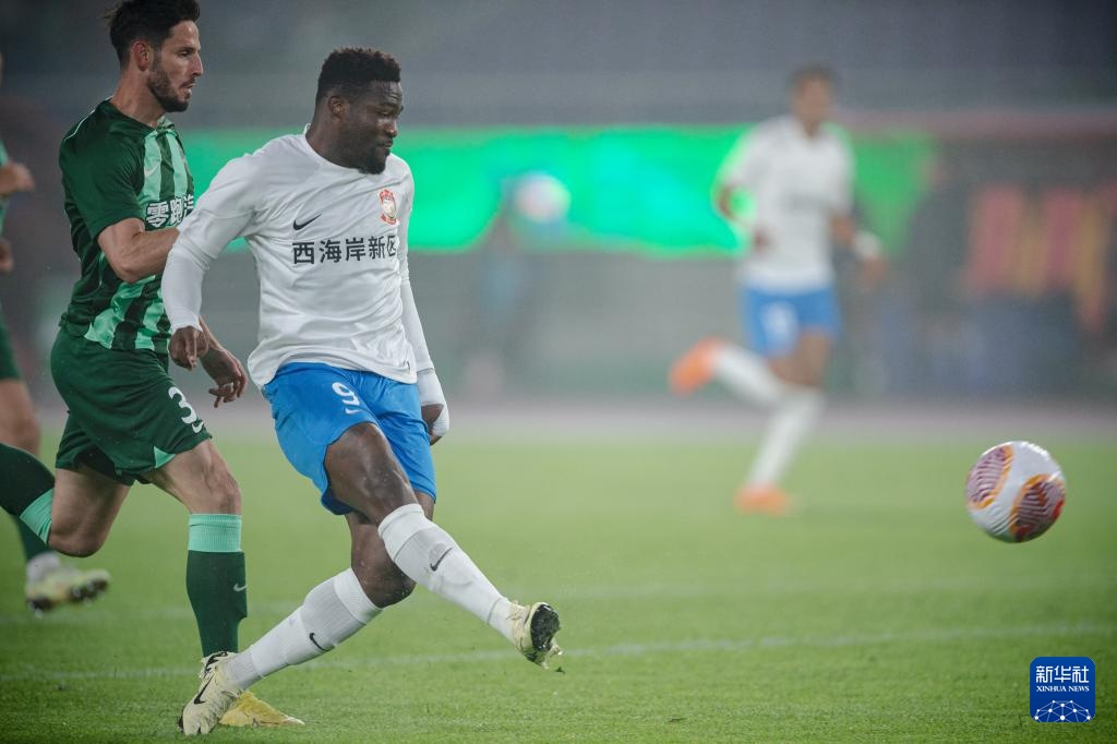 4月6日,青岛西海岸队球员让大卫·比乌奎尔在比赛中射门。新华社记者 江汉 摄