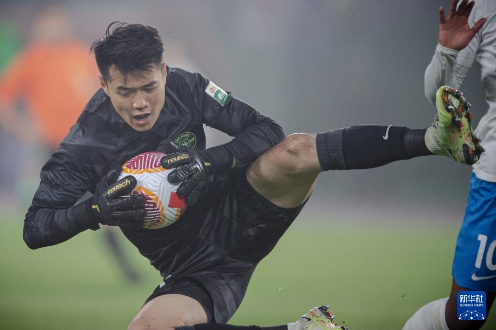 4月6日,浙江队守门员赵博在比赛中扑救。新华社记者 江汉 摄