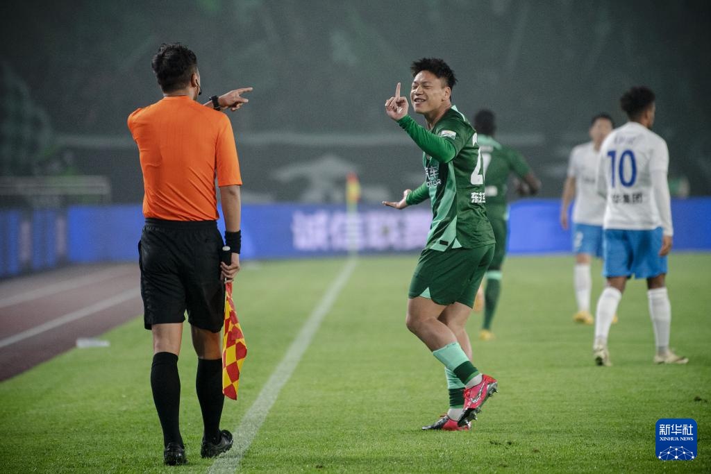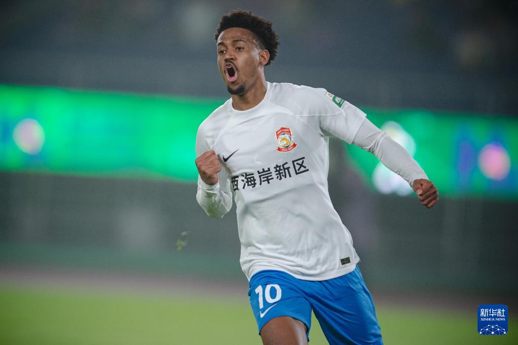 4月6日,青岛西海岸队球员内尔松·卢斯在比赛中进球后庆祝。新华社记者 江汉 摄