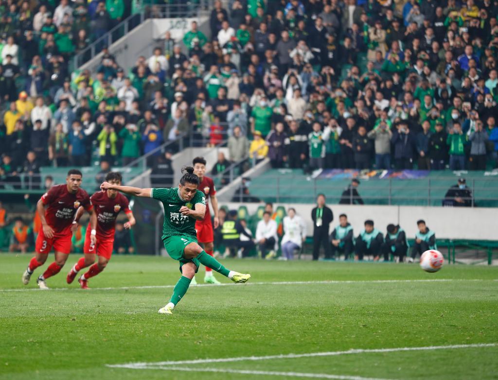 4月5日,北京国安队球员张玉宁(前)在对阵上海海港队的比赛中主罚点球破门。新华社记者 胡星宇 摄