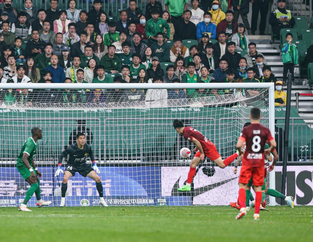 4月5日晚,五万多名球迷来到“新工体”,他们为北京国安营造的主场氛围,堪比一些欧洲联赛场次中的名场面。卫冕冠军上海海港队虽然控球率和传球次数占优,并在开场不久即由武磊打入精彩的世界波,但老牌劲旅北京国安随后2:1实现反超,最终武磊在全场伤停补时阶段上演头球绝平。中超官网统计,两队在比赛中一共有34次射门。从比赛观感来说,除了精彩的进球,比赛节奏快、对抗强度高、内容流畅,这些方面都令球迷看得过瘾。