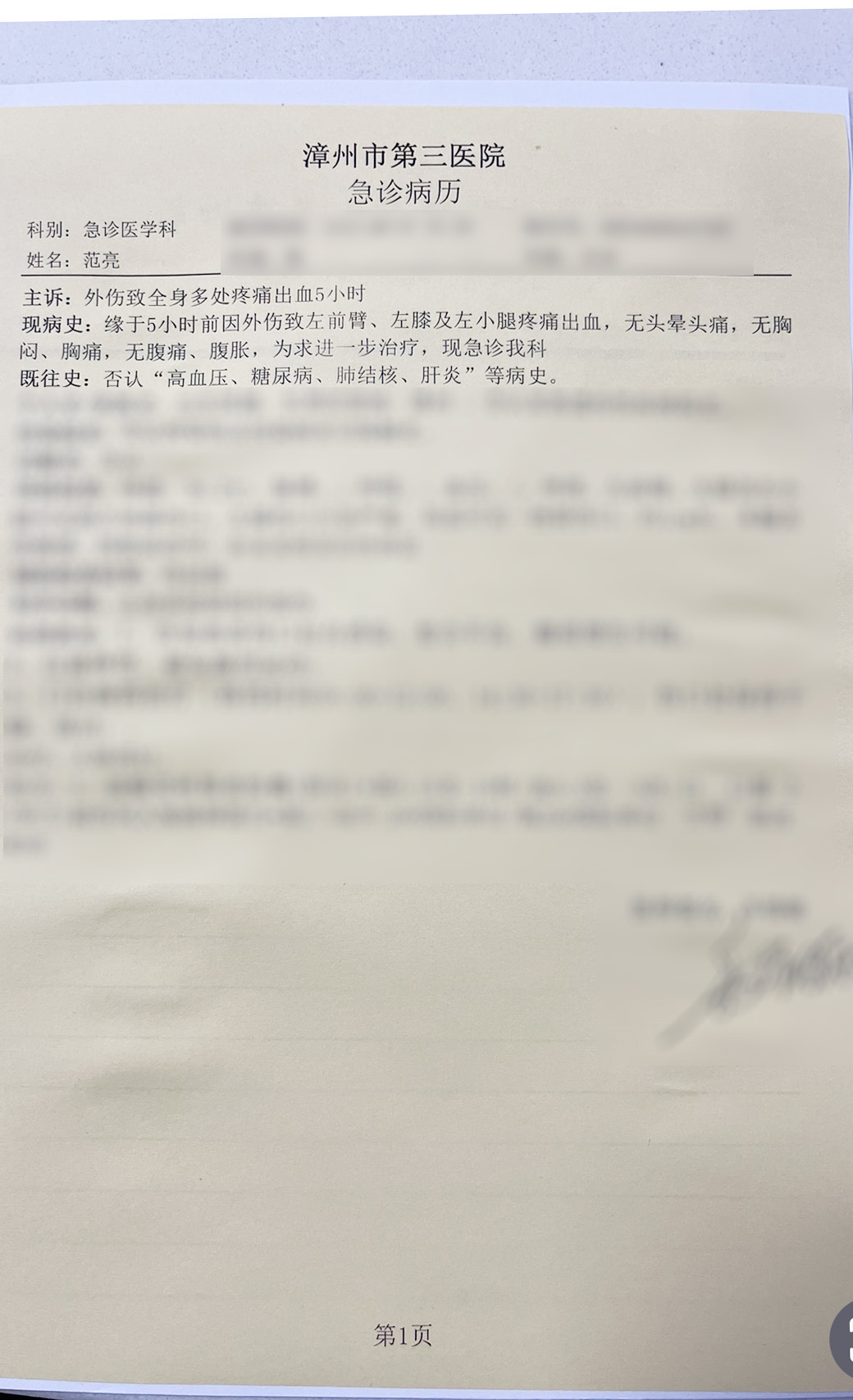 此时一名战友指着范亮的左腿呼到:“亮仔,你的腿受伤了!”范亮这才发现左膝下方不知什么时候被钢筋戳出一个小拇指粗的窟窿,伤口还在汩汩往外冒血,战友连忙劝范亮先去医院包扎治疗。
