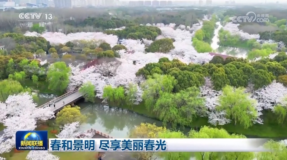 在上海宝山区,公园里迎来盛花期的樱花,美不胜收,这片樱花的海洋吸引人们徜徉其中、驻足拍照。在陕西西安,这条两公里长的道路两旁,数百棵樱花树竞相绽放,延绵成一片花海,市民和车辆从中经过,享受着古城春天这抹浪漫的色彩。在河北沧州,梨花盛开,雪白的梨花令人陶醉,众多游客前来感受春日美景。