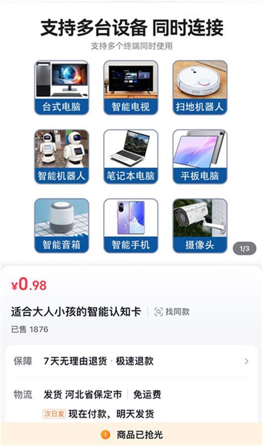 直播回放中,记者找到了张女士购买的这款商品。商品标题为“适合大人小孩的认知卡”,其中一张图片显示,该卡支持多台设备,可以同时连接台式电脑、智能电视、扫地机器人、智能音箱、摄像头等终端。