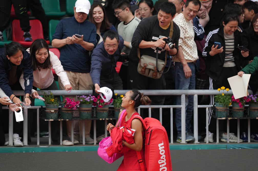 4月9日,中国队选手郑钦文在单打比赛后与观众互动。她2:0战胜中国台北队选手杨亚依。新华社记者 薛宇舸 摄