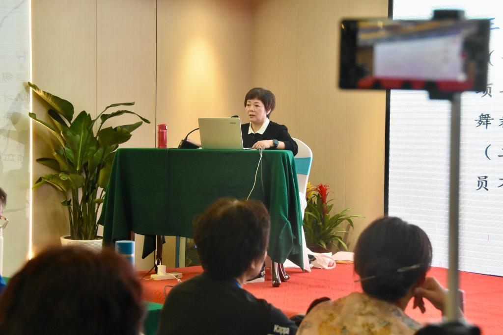 匡小红在台上给学员讲授老年人广场舞最新规则。新华社记者 郑昕 摄