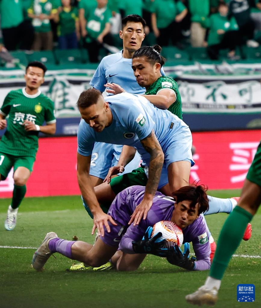 4月9日,北京国安队球员张玉宁(右一)与深圳新鹏城队球员杜加利奇(左一)、守门员彭鹏(下)在门前拼抢后。新华社记者 王丽莉 摄