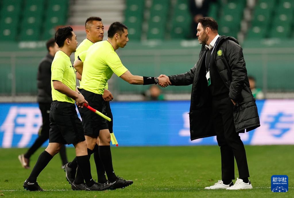 4月9日,北京国安队主教练里卡多·苏亚雷斯(右一)在赛后与主裁判黄翼握手致意。新华社记者 王丽莉 摄