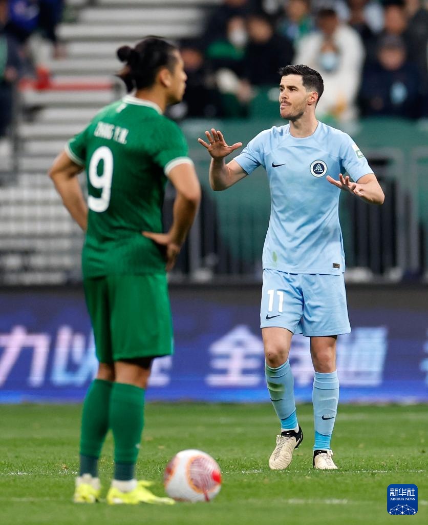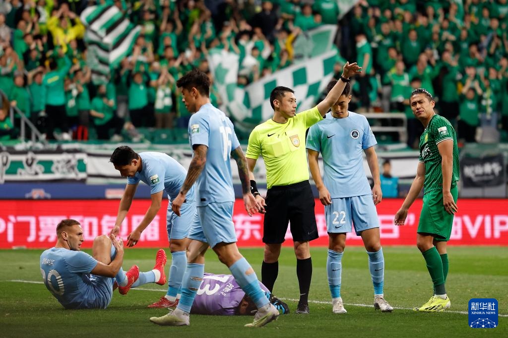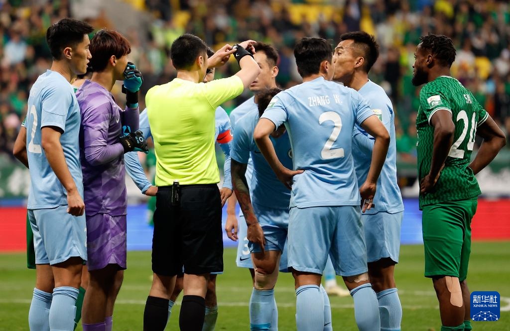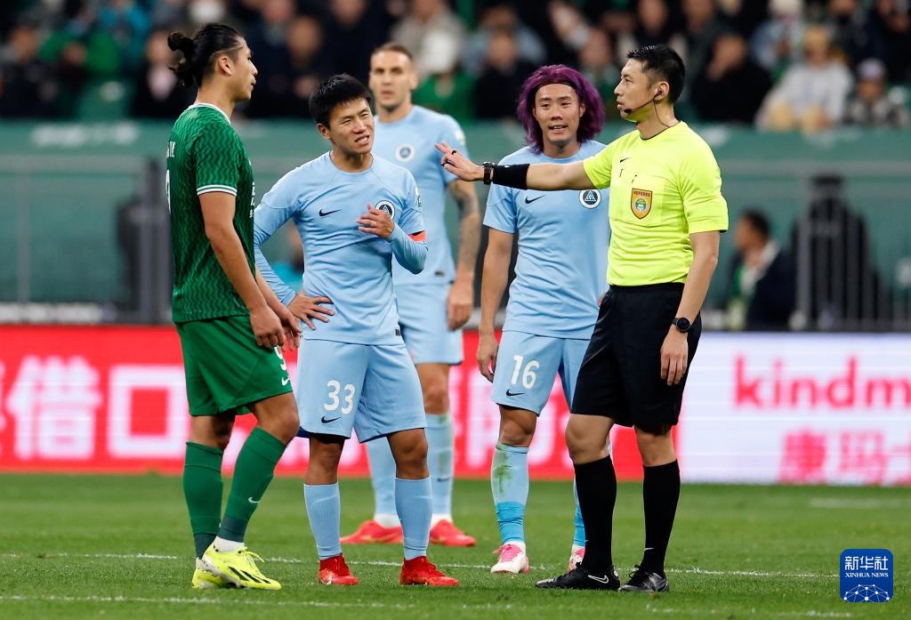 4月9日,北京国安队球员张玉宁(左一)与主裁判黄翼(右一)交流。新华社记者 王丽莉 摄