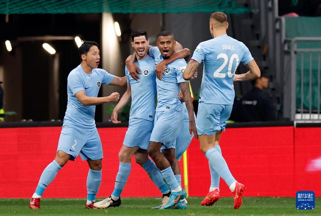 4月9日,深圳新鹏城队球员埃杜·加西亚(左四)进球后与队友庆祝。新华社记者 王丽莉 摄