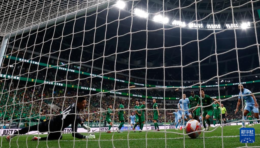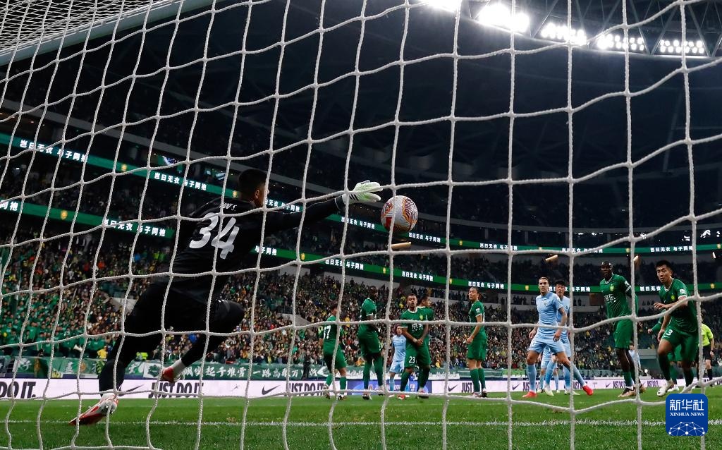 4月9日,北京国安队守门员侯森(左一)未能扑出深圳新鹏城队球员李智的任意球。新华社记者 王丽莉 摄