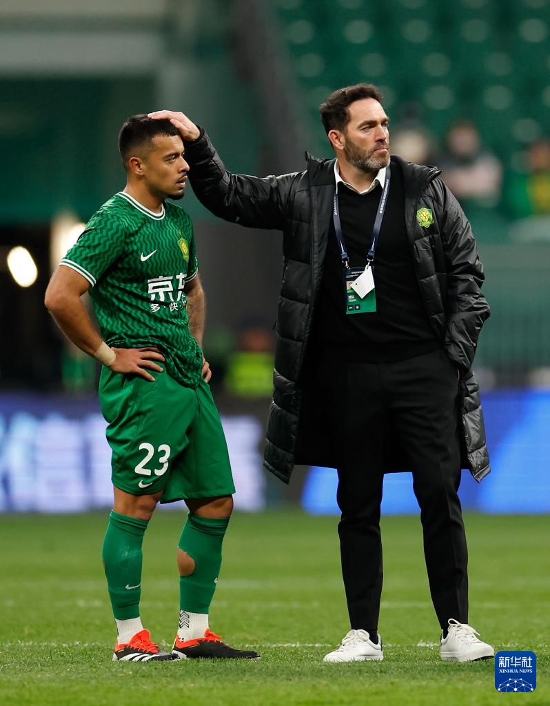 4月9日,北京国安队主教练里卡多·苏亚雷斯(右)在比赛后安慰球员李可。新华社记者 王丽莉 摄