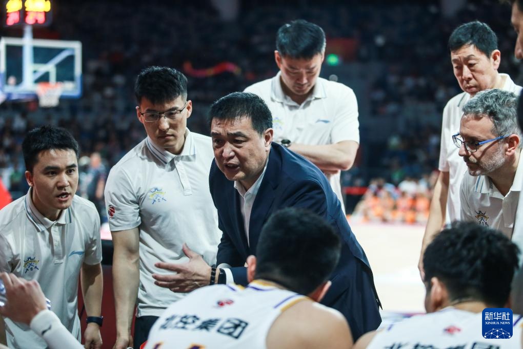 4月10日,北京控股队主教练闵鹿蕾(左三)在场边布置战术。新华社发(彭志刚摄)