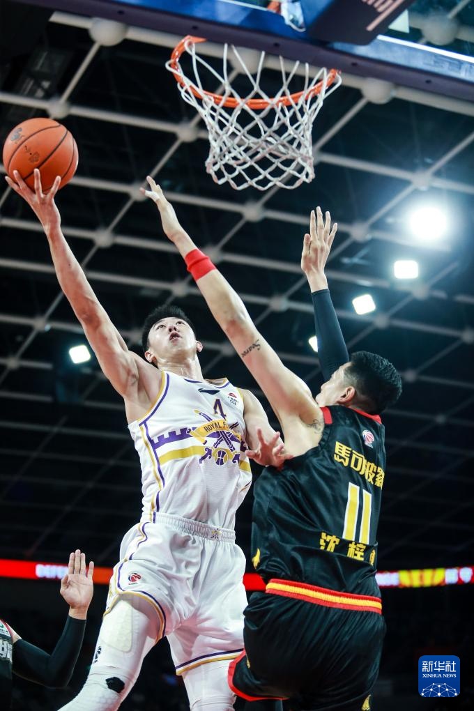 4月10日,北京控股队球员王少杰(左)在比赛中上篮。新华社发(彭志刚摄)