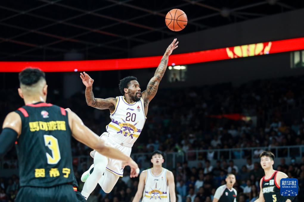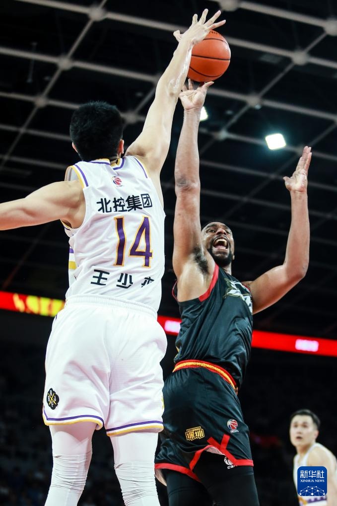 4月10日,北京控股队球员费尔德(上)在比赛中投篮。新华社发(彭志刚摄)