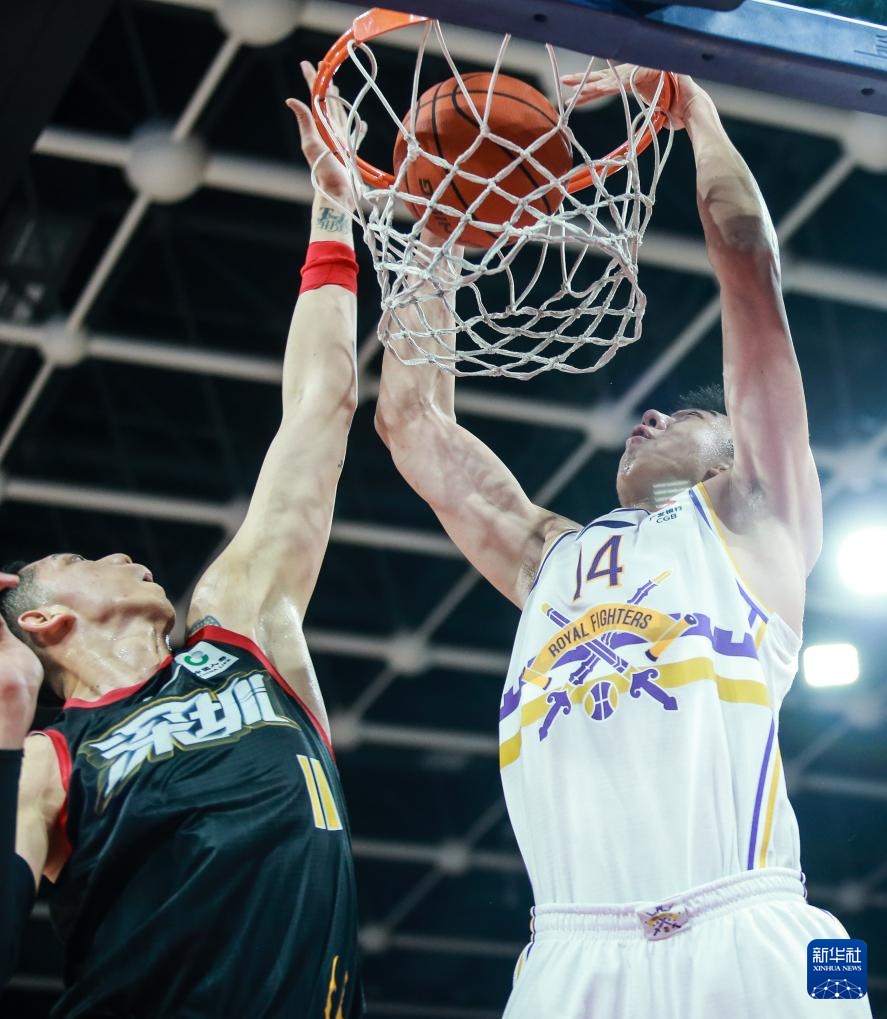 4月10日,北京控股队球员王少杰(右)在比赛中扣篮。新华社发(彭志刚摄)