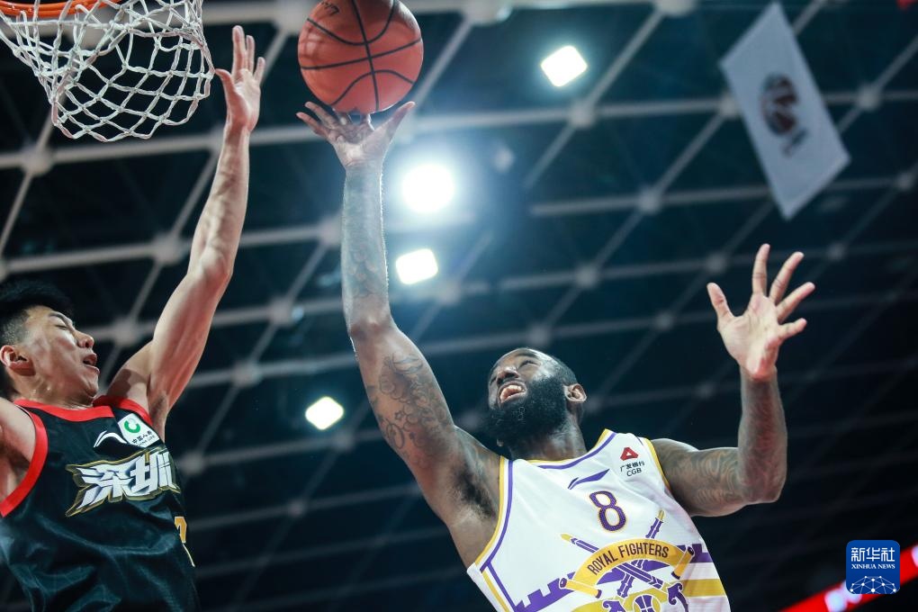 4月10日,深圳马可波罗队球员萨林杰(前右)在比赛中投篮。新华社发(彭志刚摄)