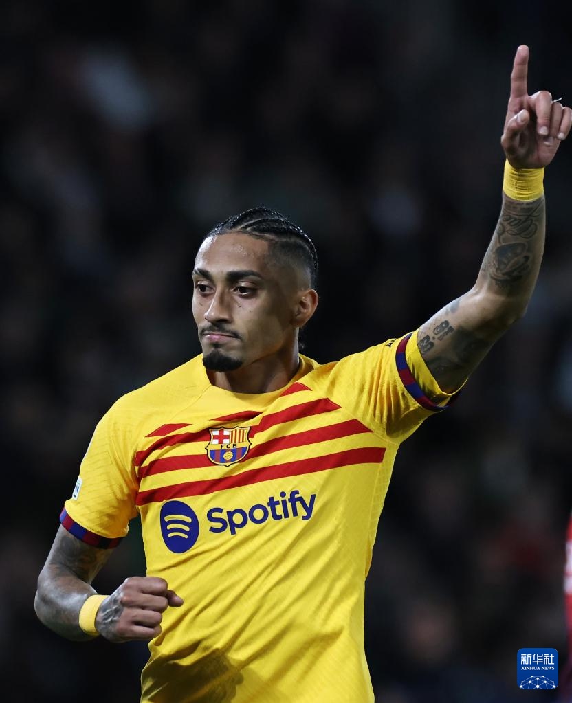 4月10日,巴塞罗那队球员拉菲尼亚在比赛中庆祝进球。新华社记者 高静 摄