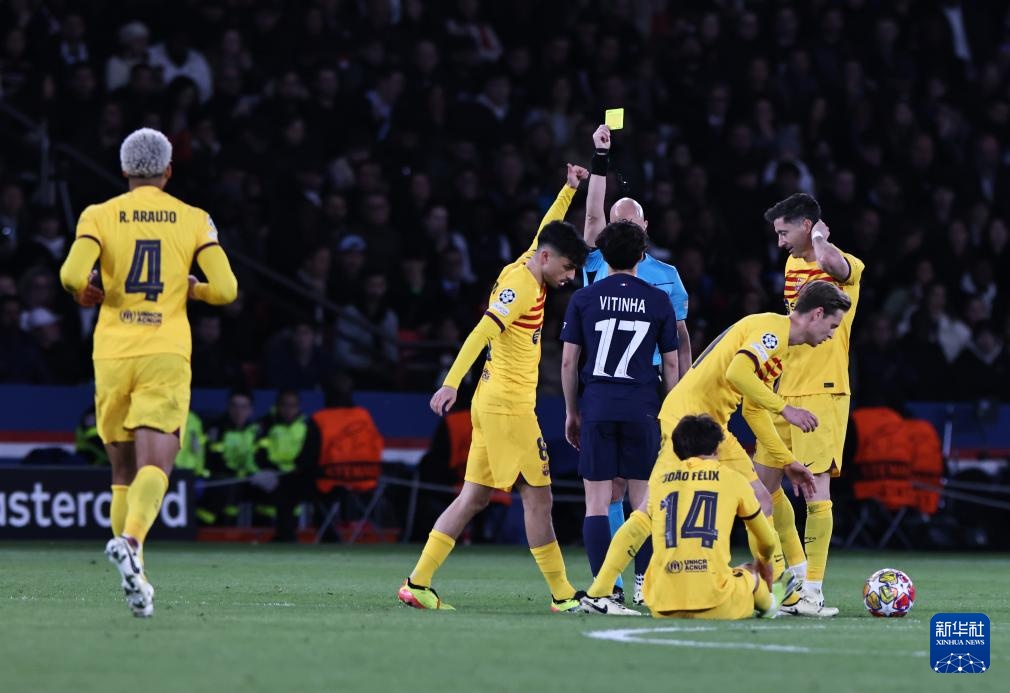4月10日,裁判向巴黎圣日耳曼队球员维蒂尼亚-费雷拉(前左三)出示黄牌。新华社记者 高静 摄