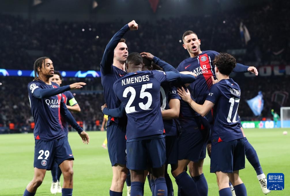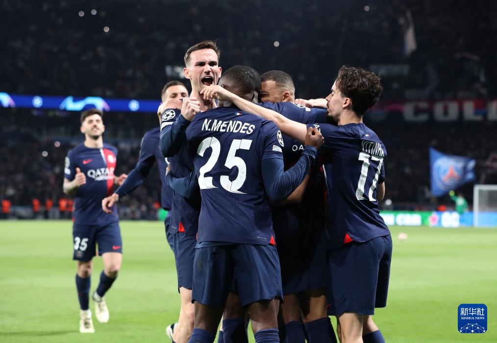 4月10日,巴黎圣日耳曼队球员庆祝进球。新华社记者 高静 摄