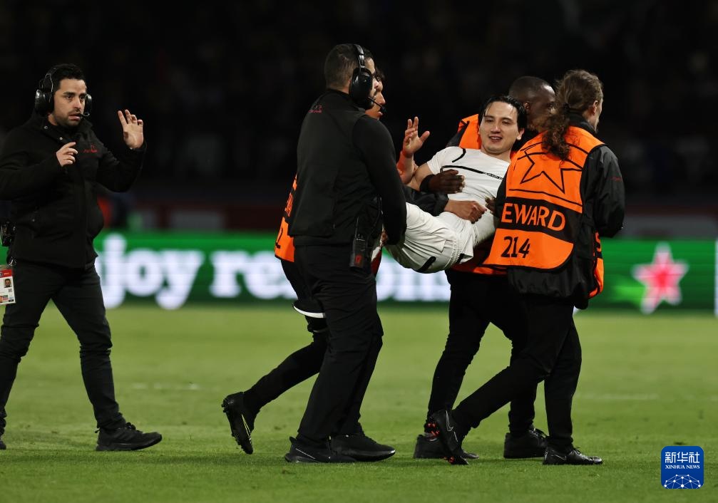 4月10日,工作人员将闯入场内的球迷抬出。新华社记者 高静 摄