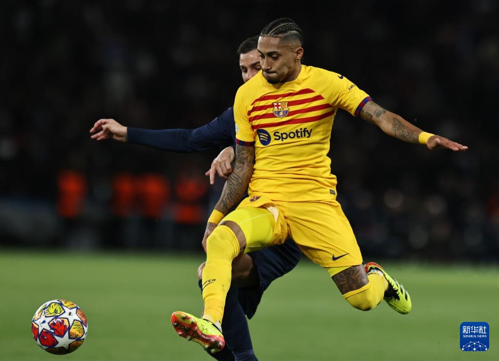 4月10日,巴塞罗那队球员拉菲尼亚(右)在比赛中。新华社记者 高静 摄