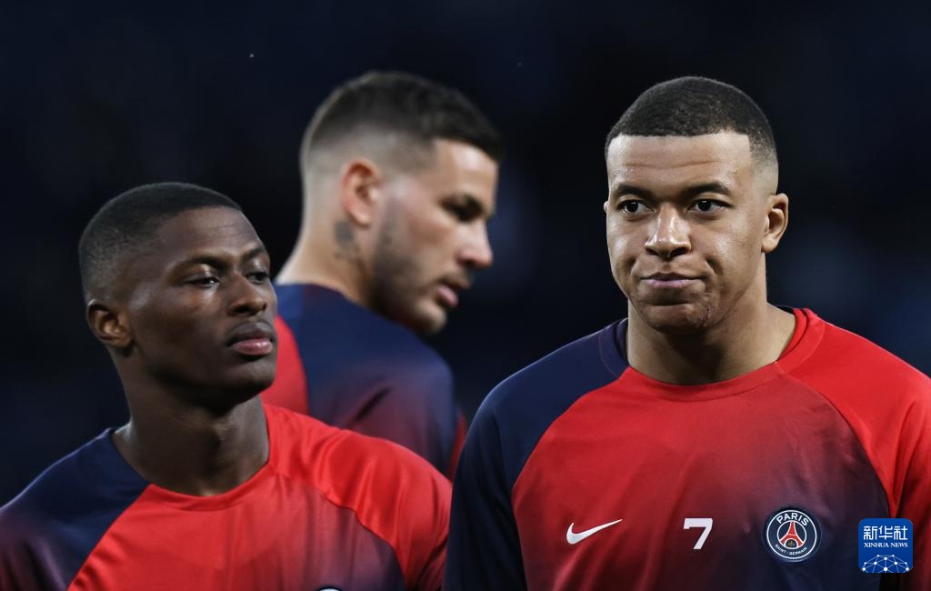 4月10日,巴黎圣日耳曼队球员姆巴佩(左)在比赛前热身。新华社记者 高静 摄