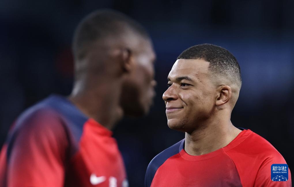 4月10日,巴黎圣日耳曼队球员姆巴佩(右)在比赛前热身。新华社记者 高静 摄