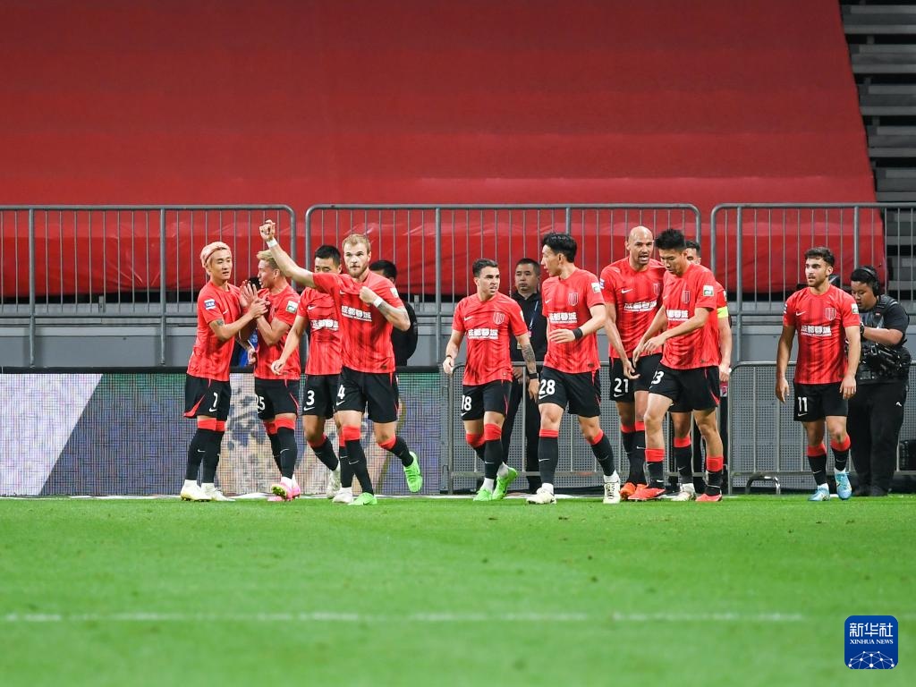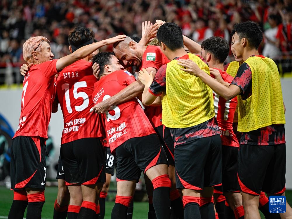 4月10日,成都蓉城队球员庆祝进球。新华社记者 王曦 摄