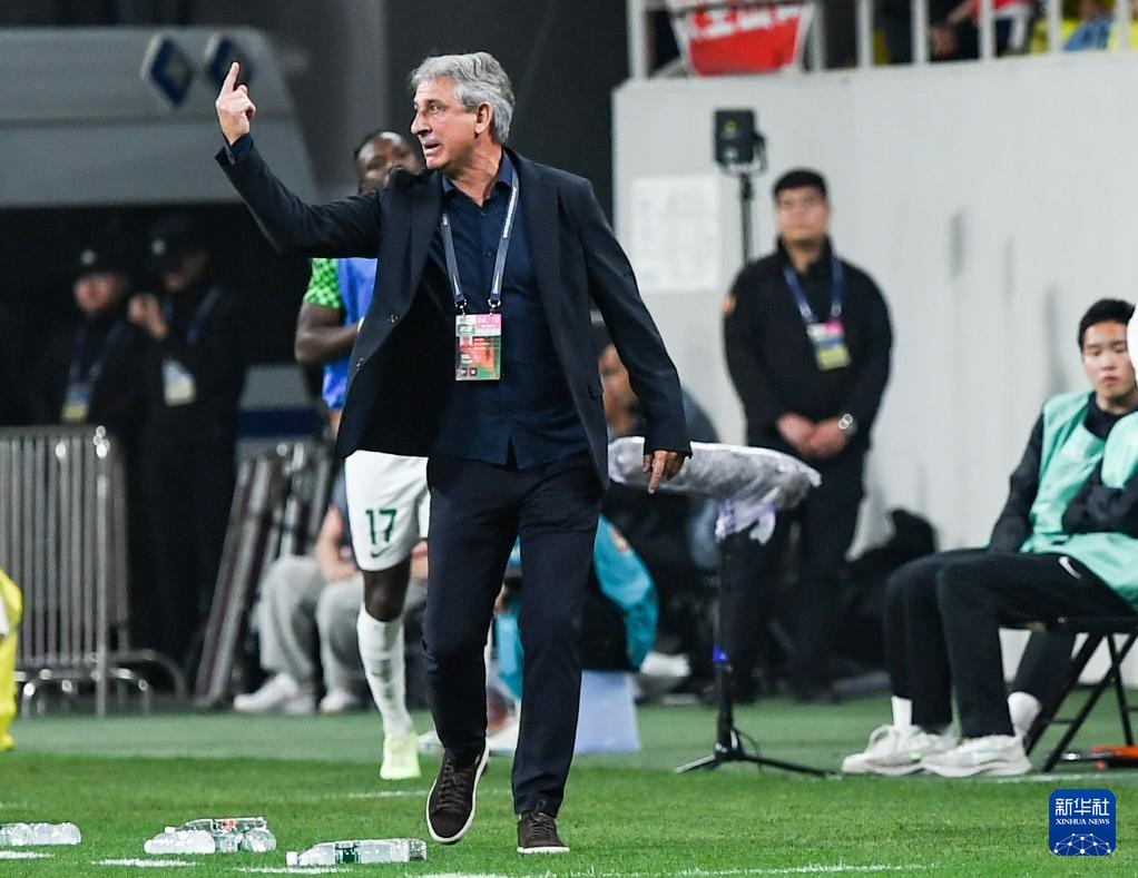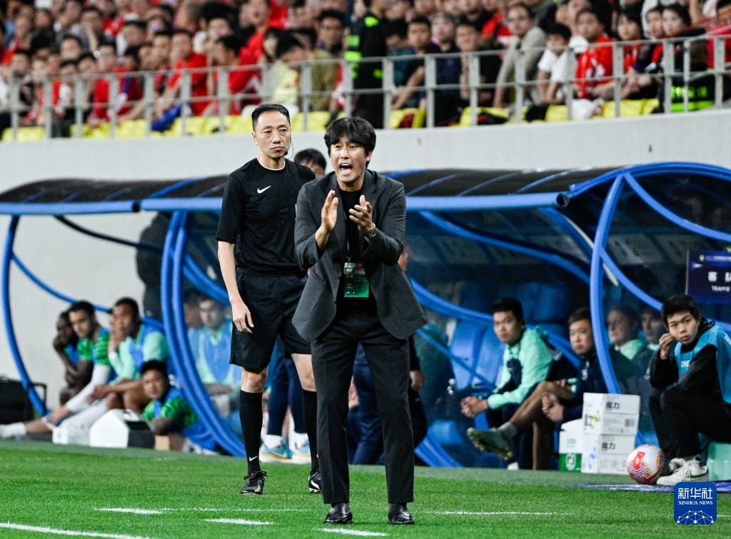 4月10日,成都蓉城队球员主教练徐正源(右)在比赛中鼓励球员。新华社记者 王曦 摄