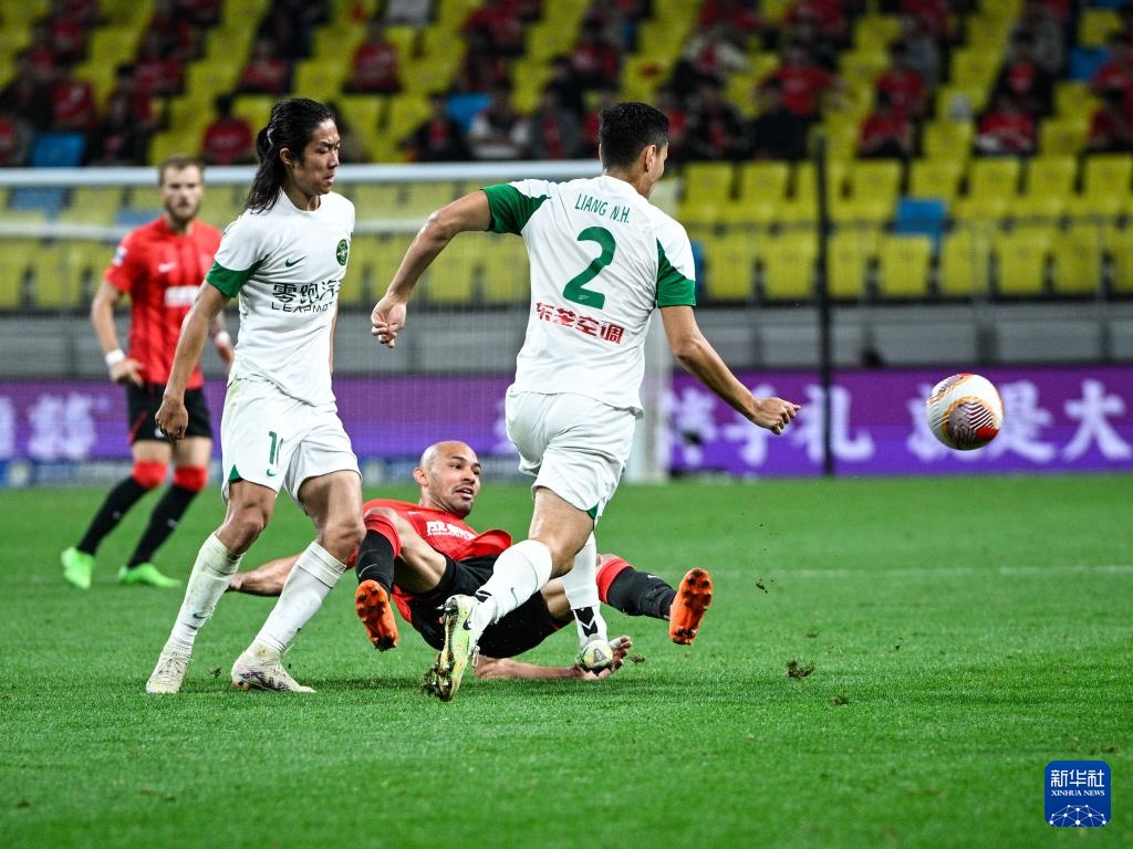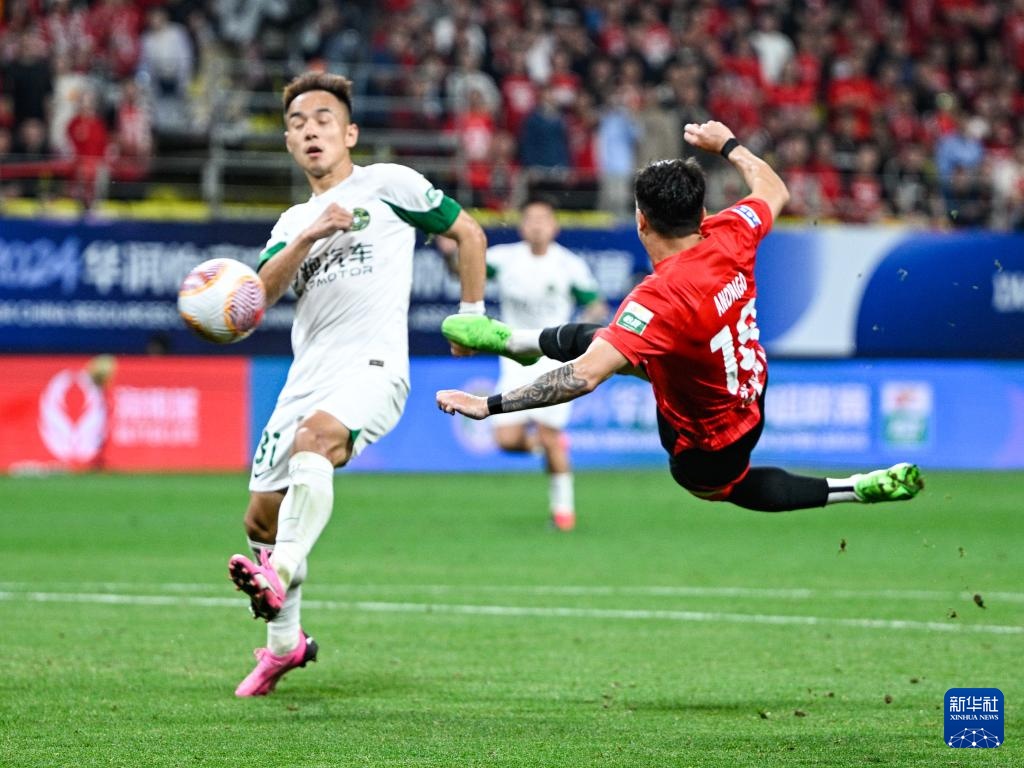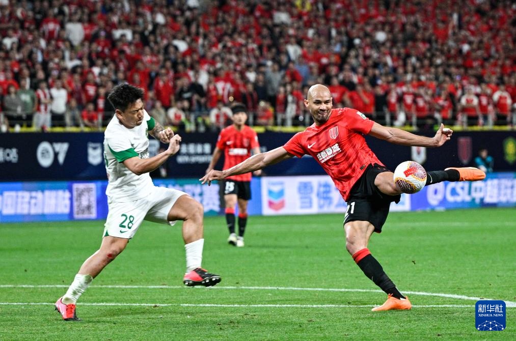 4月10日,成都蓉城队球员费利佩(右)在比赛中射门。新华社记者 王曦 摄