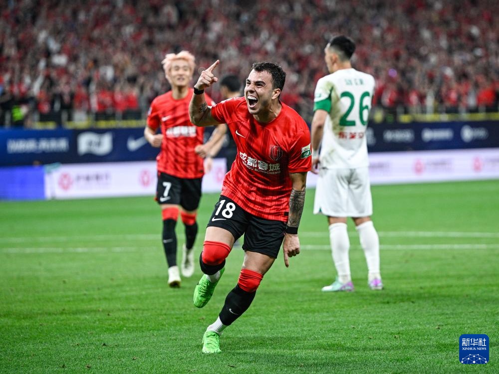 4月10日,成都蓉城队球员安德里戈(前)庆祝进球。新华社记者 王曦 摄