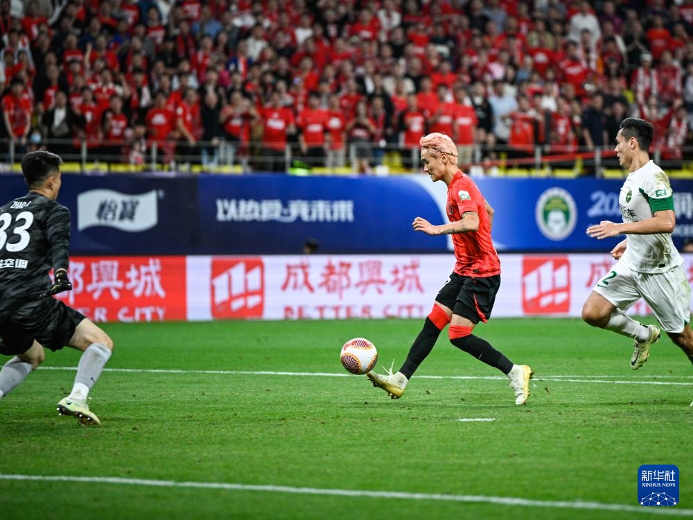 4月10日,成都蓉城队球员安德里戈(右)在比赛中射门得分。新华社记者 王曦 摄