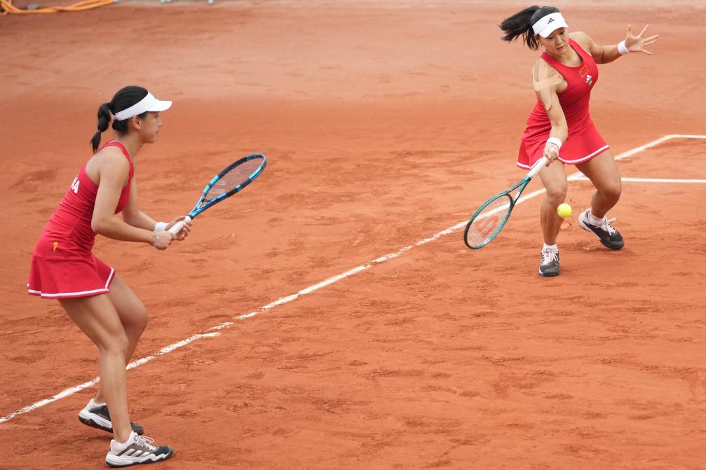 4月11日,中国队组合郭涵煜(右)/王欣瑜在双打比赛中。她们2:1战胜新西兰队组合卢特利芙/孙璐璐。新华社记者 薛宇舸 摄