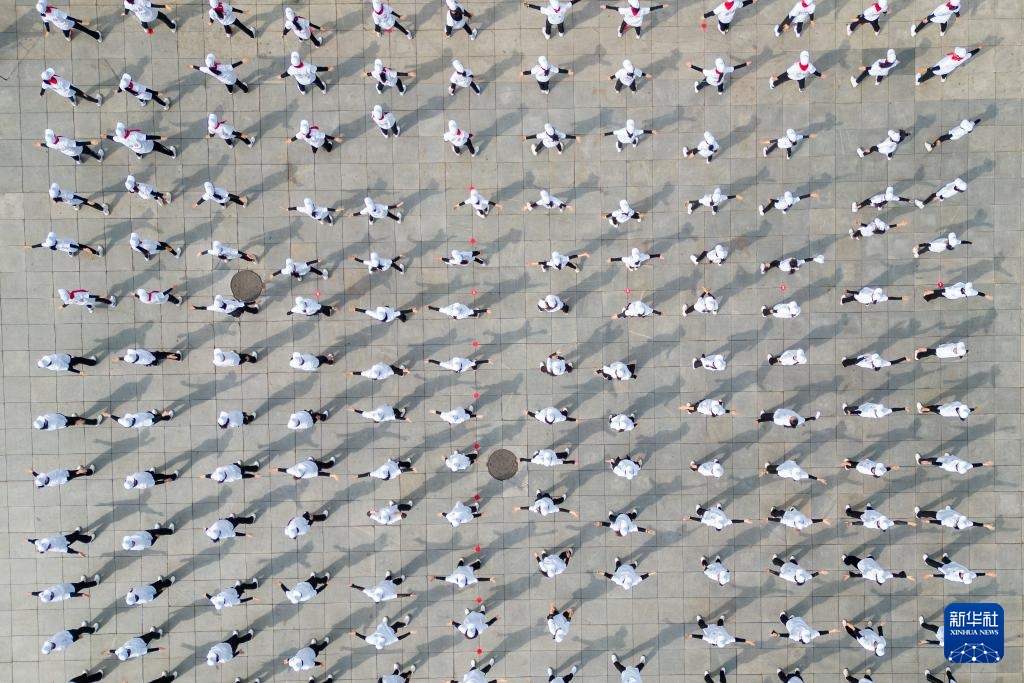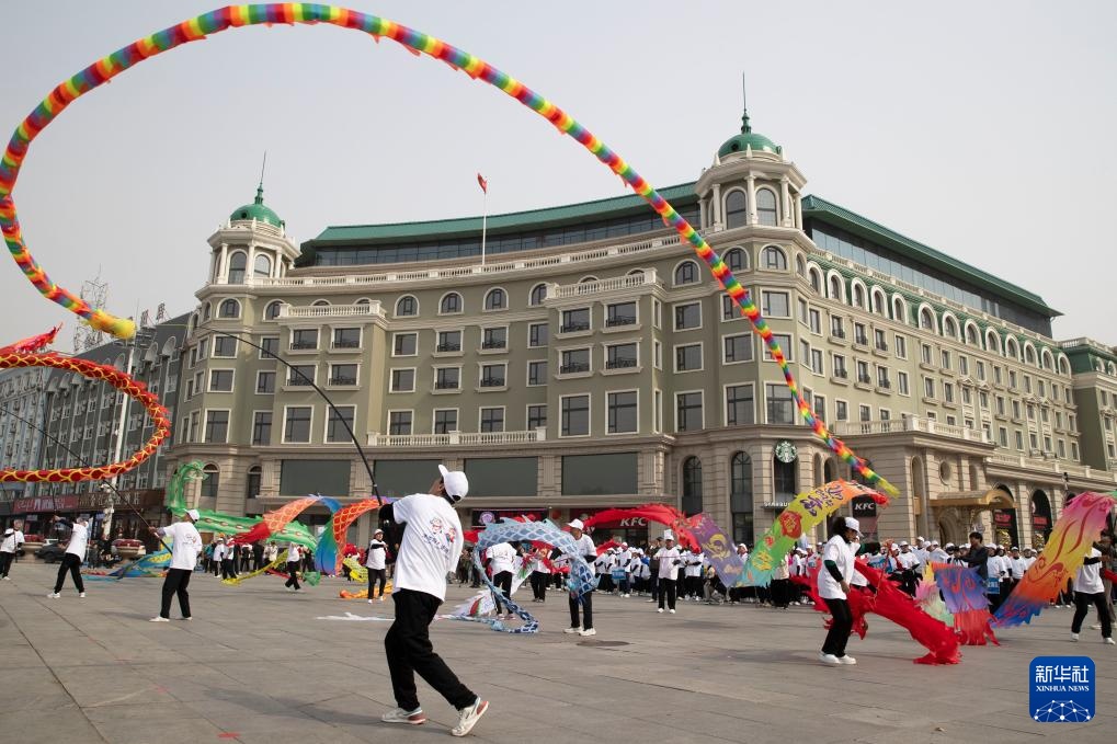 4月12日,市民在全民健身展演活动中表演(无人机照片)。新华社记者 张涛 摄