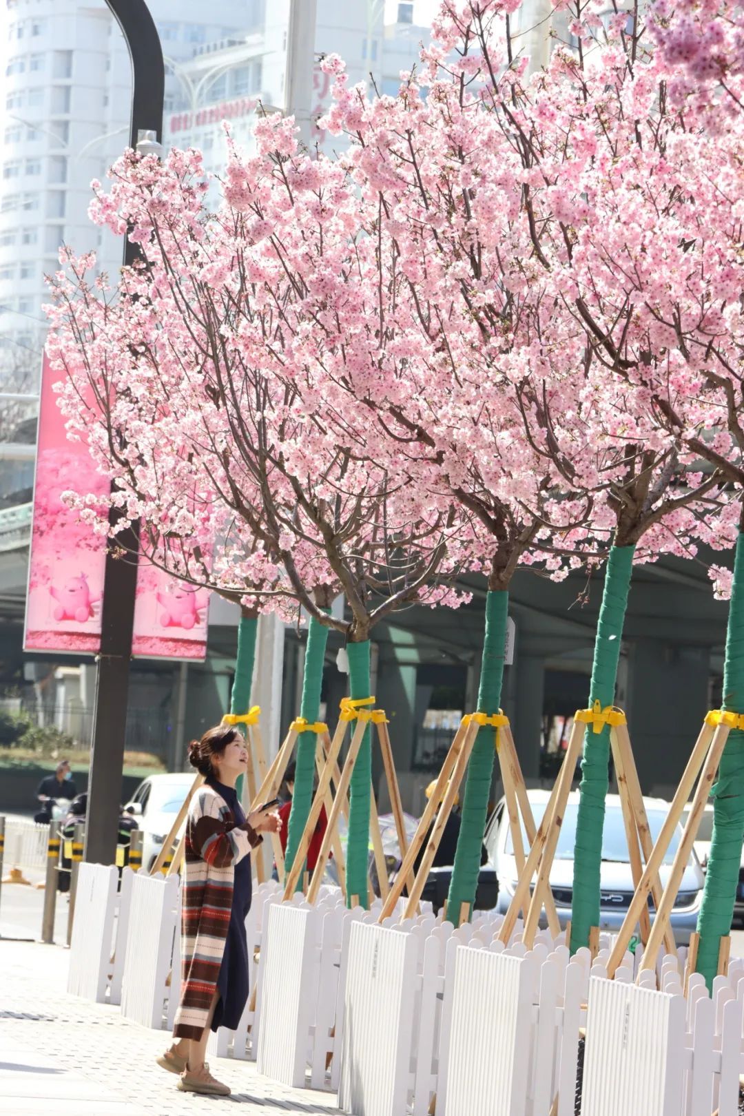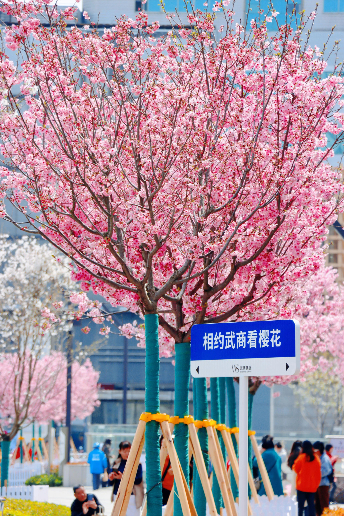 3月21日,在武商梦时代商场门前,樱花树成片盛开。(湖北日报全媒记者 倪娜 通讯员 杨升 张柳君 摄)