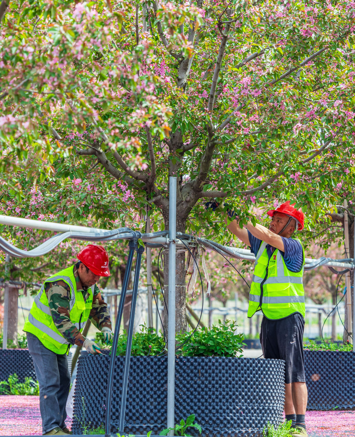 柏泉苗圃内,苗业公司的修剪团队正在养护海棠花。