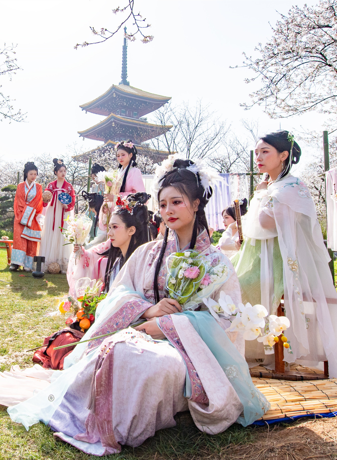 身着国潮服饰的游客在武汉樱花园赏花拍照。(湖北日报全媒记者 何宇欣 通讯员 邹卉 摄)