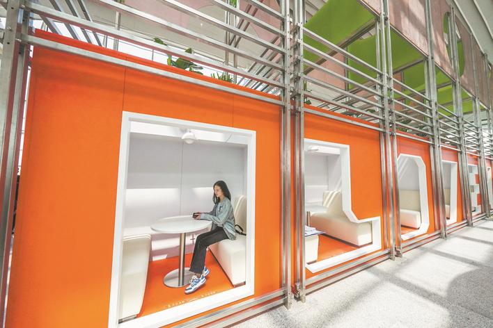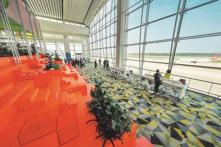 据介绍,6层景观大台阶可同时容纳近100人就座,玻璃幕墙外的机场跑道上1分钟左右就有一架飞机起降。这里可以免费就座,无需旅客另外消费,有望成为新“网红”打卡点。玻璃幕墙附近的桌椅上配备有充电插座,可以免费充电,为旅客出行提供便利。