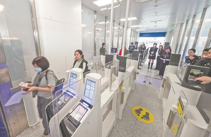 T2航站楼采用“两机两门双通道”安检模式,可提高旅客过检效率。旅客可以将身份证、护照或登机牌放在预检闸机的读卡器上,便进入安检待检区候检了。需要注意的是,只有办理好登机牌,或者托运的行李经检查无问题的旅客才能顺利通过。