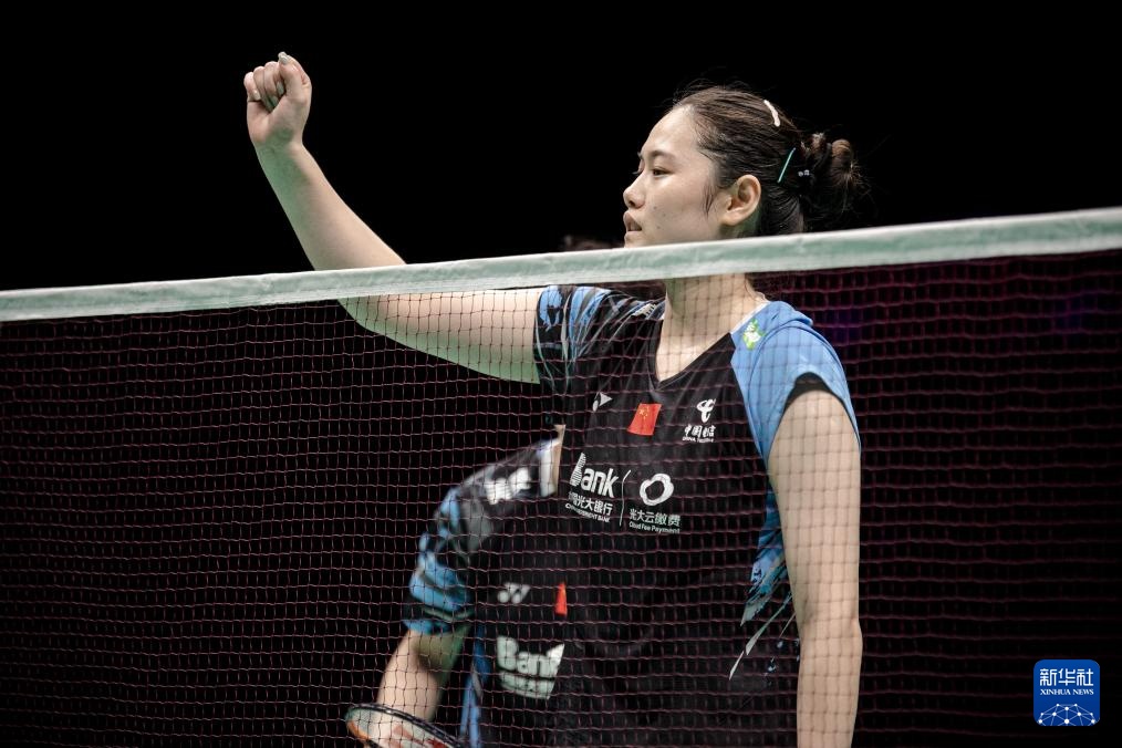 4月13日,中国组合张殊贤/郑雨(前)在女子双打半决赛中庆祝得分,最终她们2比0战胜中国组合陈清晨/贾一凡,晋级决赛。新华社记者 江汉 摄