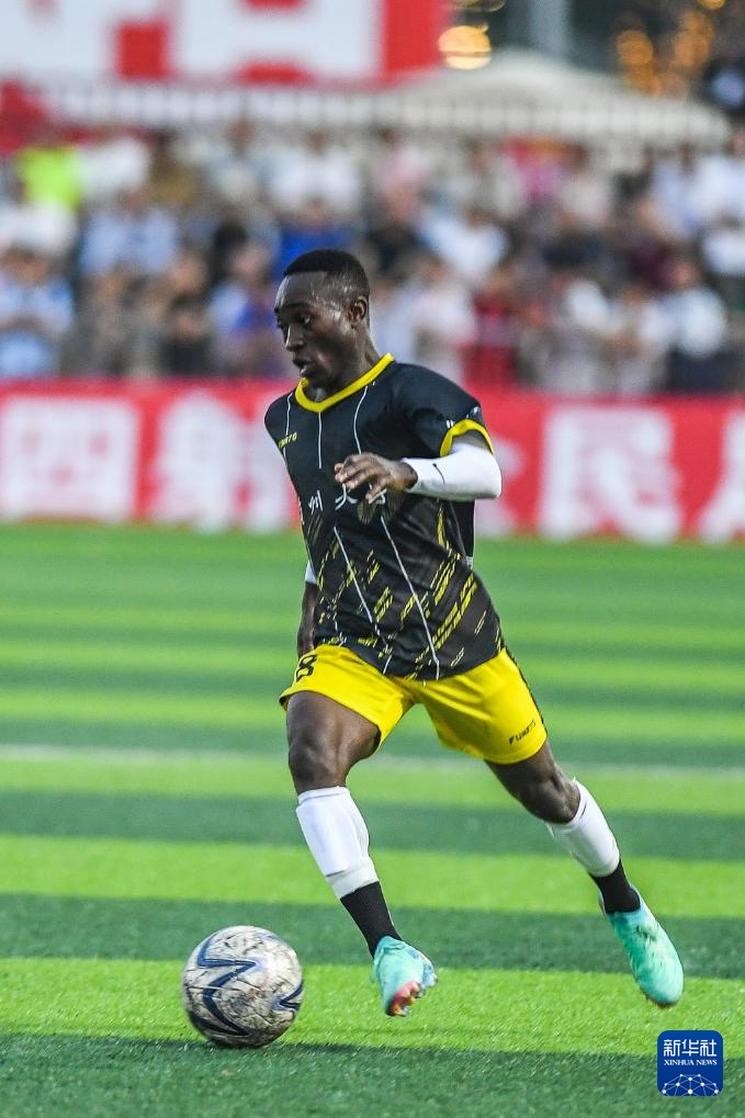 4月13日,贵州大学国际学生足球队球员欧陆安比赛中进攻。新华社记者 陶亮 摄