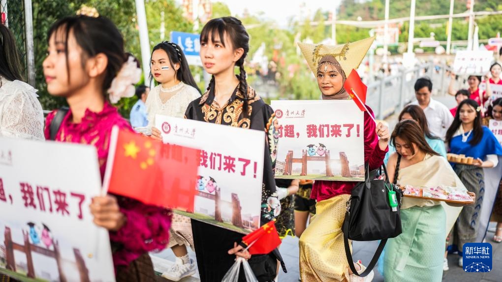 4月13日,贵州大学的留学生们在中场休息时进行歌舞表演并向观众示意。新华社记者 陶亮 摄