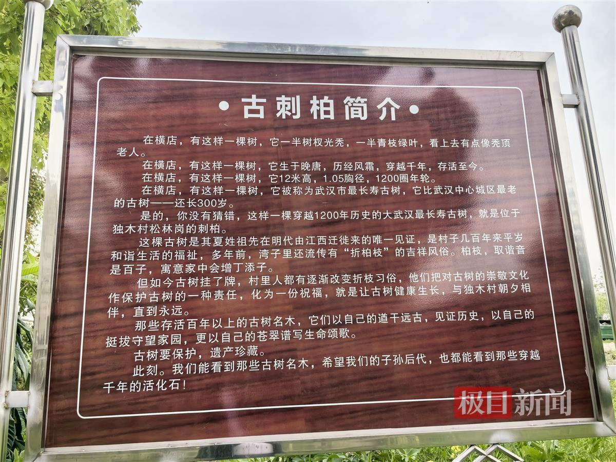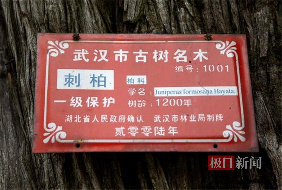 黄陂区园林和林业局的工作人员介绍,据研究人员考证,这棵刺柏生于晚唐,历经风霜,穿越千年,树高12米,胸径1.05米,年轮1200圈,比武汉中心城区最老的古树还长300岁,因此也被称为武汉市最长寿的古树。