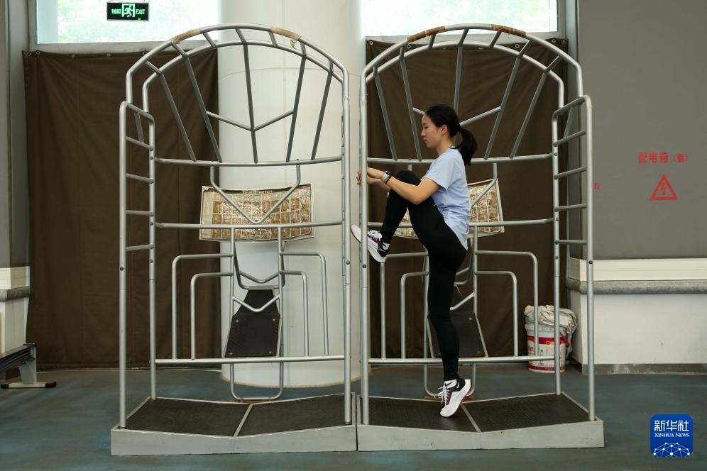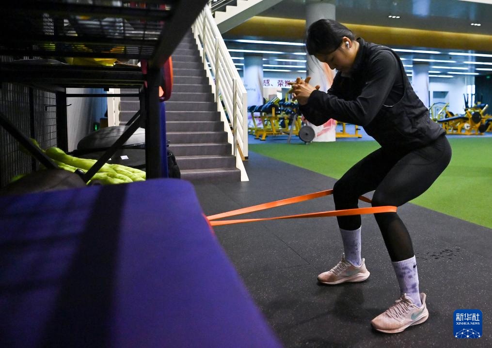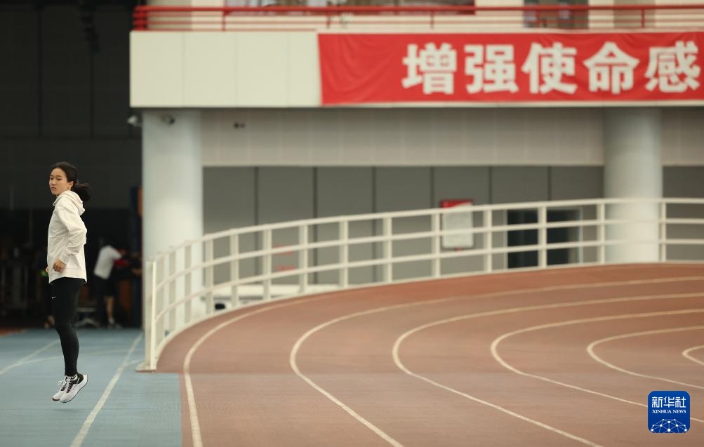 4月14日,参加集训的田径运动员陈妤颉在国家队训练基地综合馆内训练。新华社记者 李明 摄