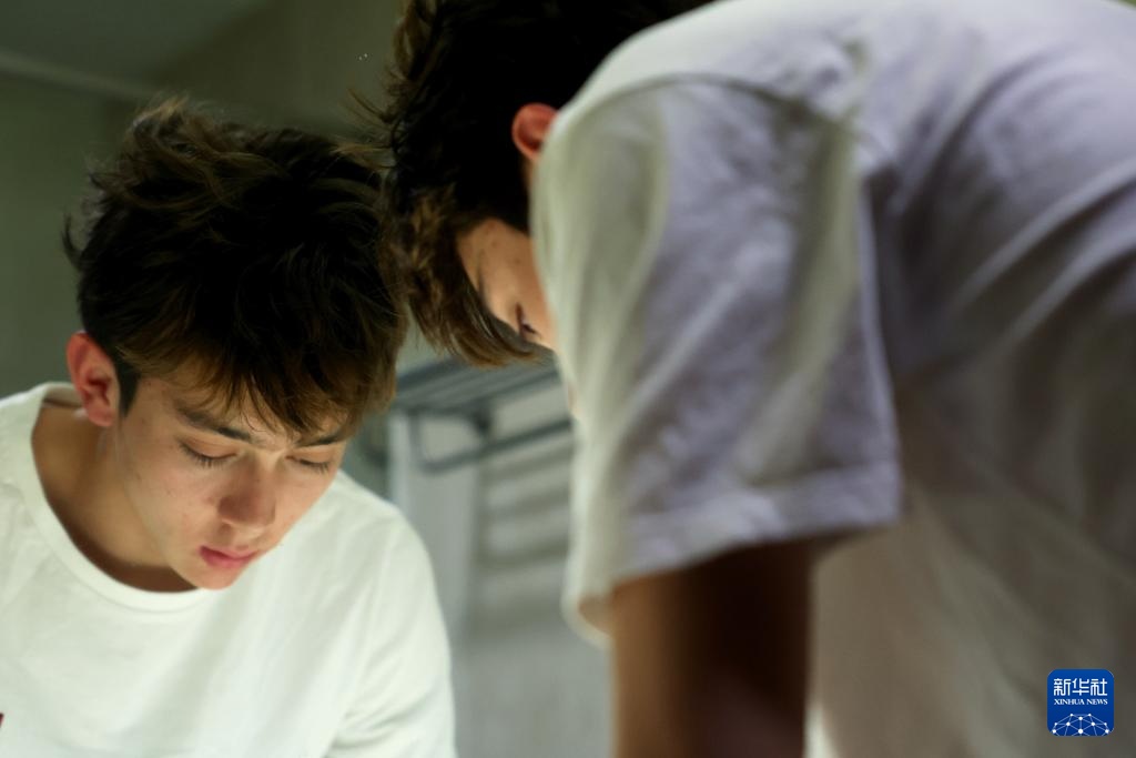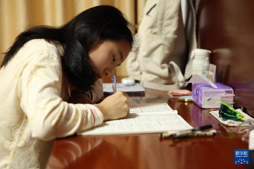 4月14日,参加集训的田径运动员陈妤颉在运动员公寓内做功课。新华社记者 李明 摄