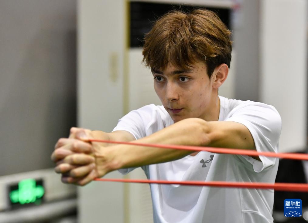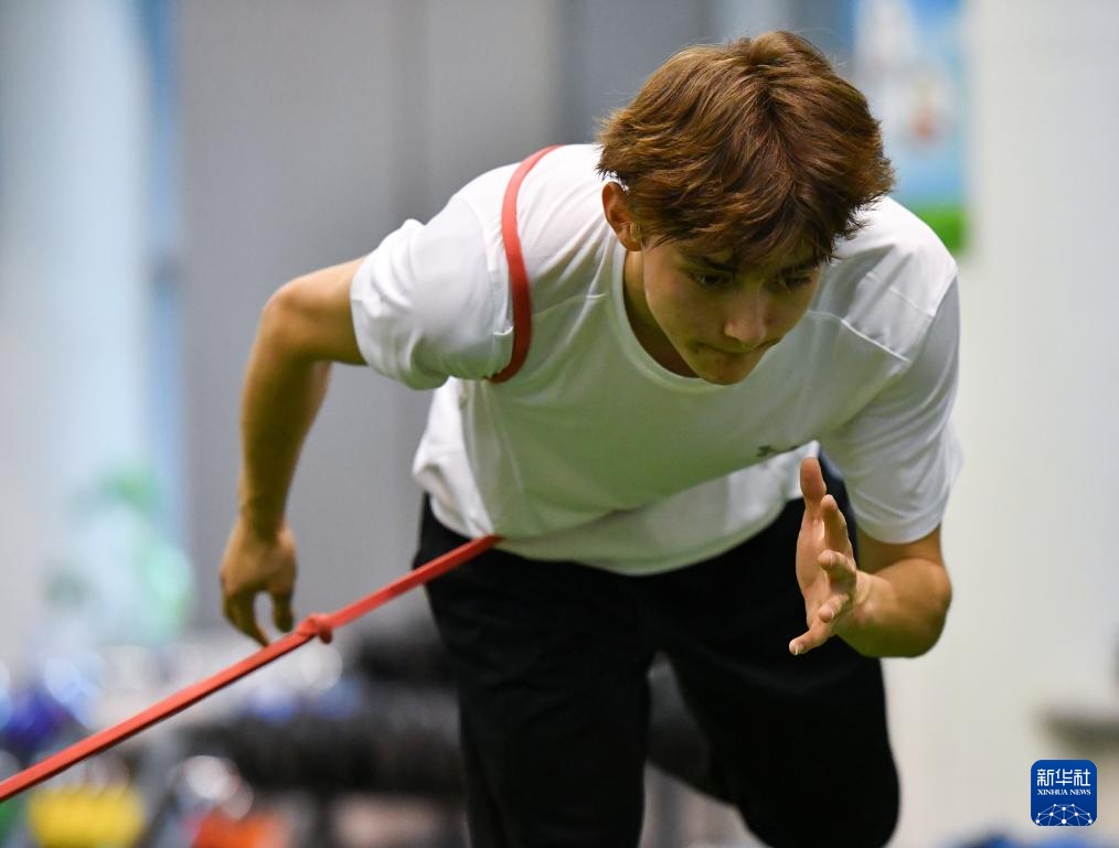4月14日,参加集训的田径运动员艾力西尔·吾买尔在体能训练间隙。新华社记者 宋彦桦 摄