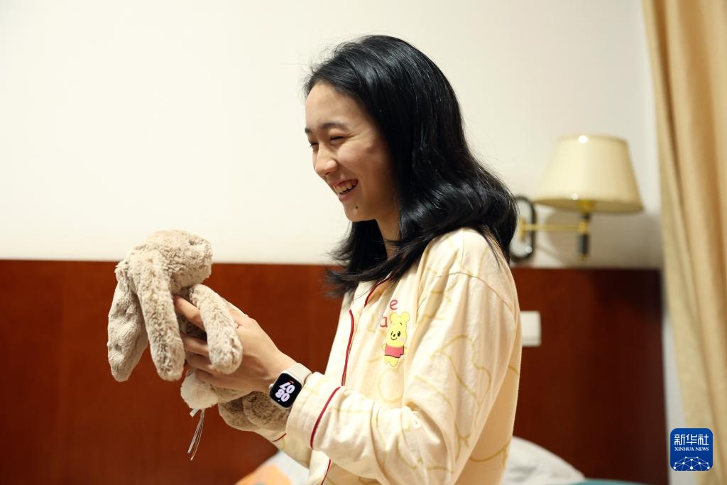 4月14日,参加集训的田径运动员陈妤颉在运动员公寓内手拿毛绒玩具。新华社记者 李明 摄