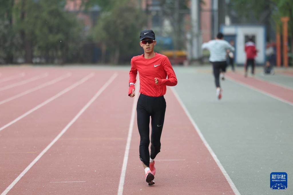 4月14日,参加集训的田径运动员李亚轩在室外田径场训练。新华社记者 李明 摄